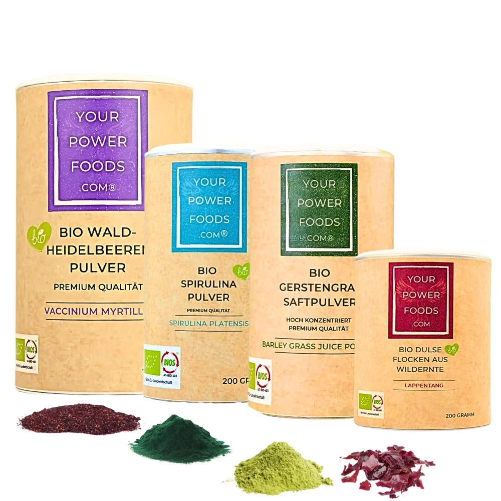 Entdecke das Heavy Metal Detox POWERFOOD Set von YourPowerFoods.com – eine sorgfältig ausgewählte Kombination aus vier hochwertigen Bio-Produkten: Bio Waldheidelbeeren Pulver, Bio Dulse Flocken aus Wildernte, Bio Spirulina Pulver und Bio Gerstengras Saftpulver. Dieses Set wurde entwickelt, um dich bei einer bewussten und natürlichen Ernährung zu unterstützen.